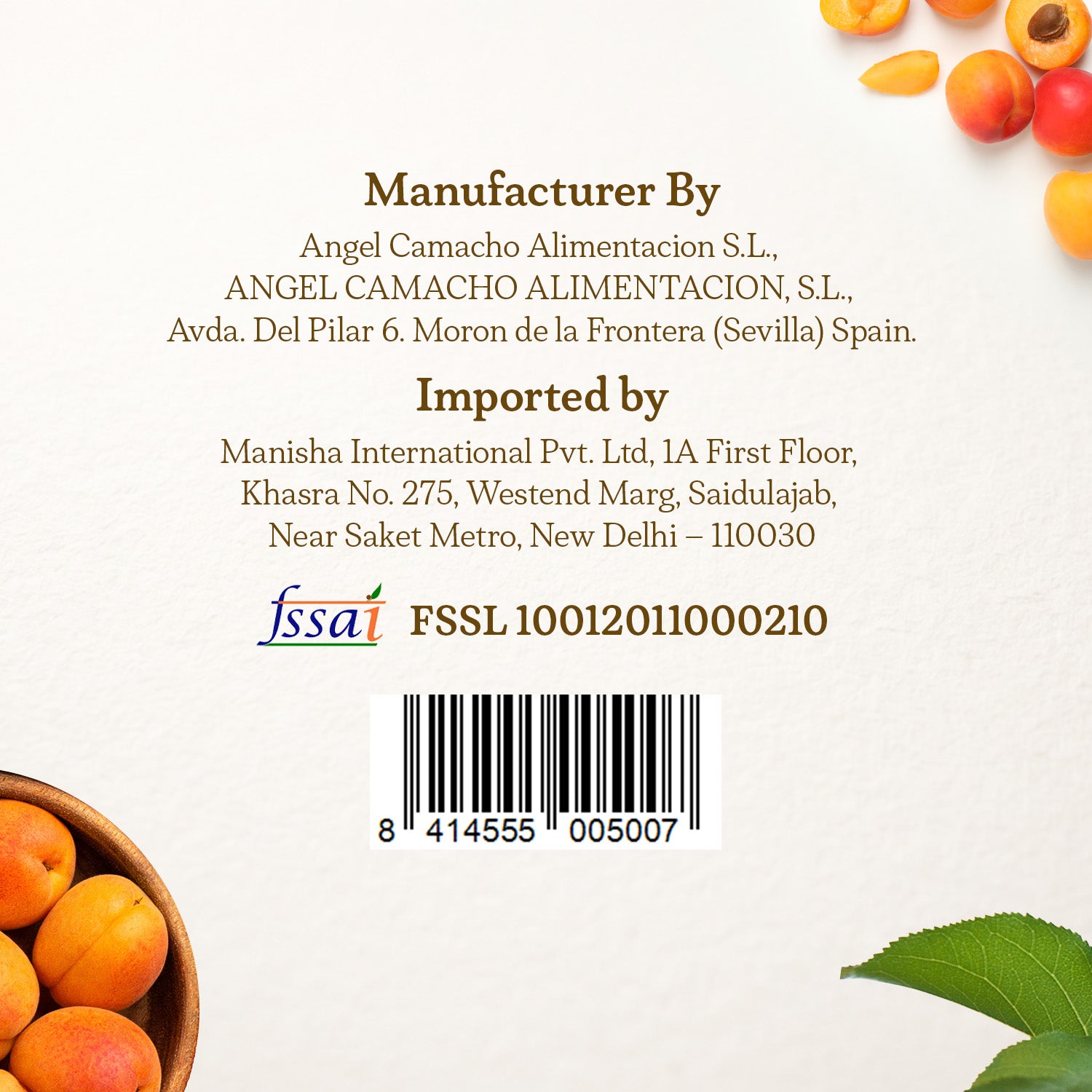 Manufacturer Details: ANGEL CAMACHO ALIMENTACION, S.L., Avda. Del Pilar 6. Moron de la Frontera (Sevilla) Spain. CIF B-41024076