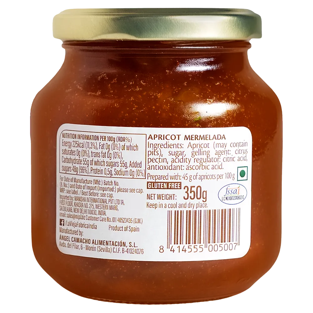 La Vieja Fábrica Apricot Mermelada is a premium jam made from ripe, juicy apricots using a 190-year-old Spanish recipe. Crafted with 100% pure fruit, this jam contains no artificial preservatives, colors, or flavors and is completely gluten-free. The result is a naturally sweet and fruity spread that brings the rich, sun-kissed taste of Spain to your table.