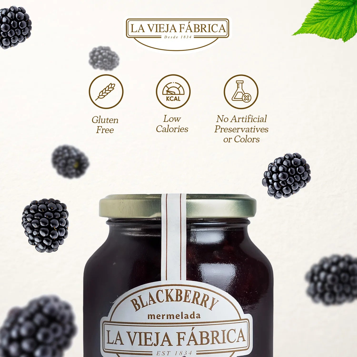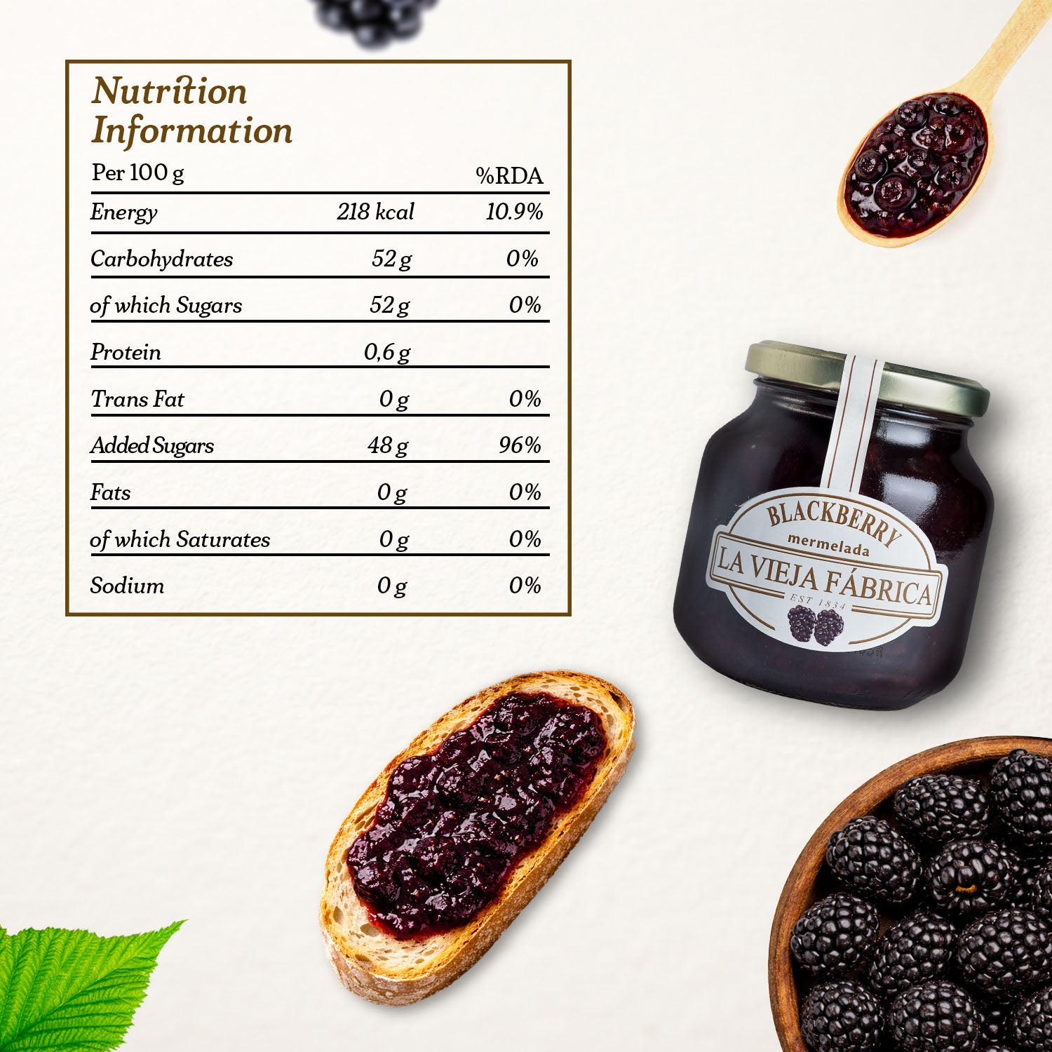 La Vieja Fábrica Blackberry Mermelada is a premium jam crafted with handpicked blackberries, following a 190-year-old traditional Spanish recipe. Made with 100% real fruit and free from gluten, artificial preservatives, or colors, this jam delivers a rich, tangy-sweet flavor and smooth texture that stands out in every bite.