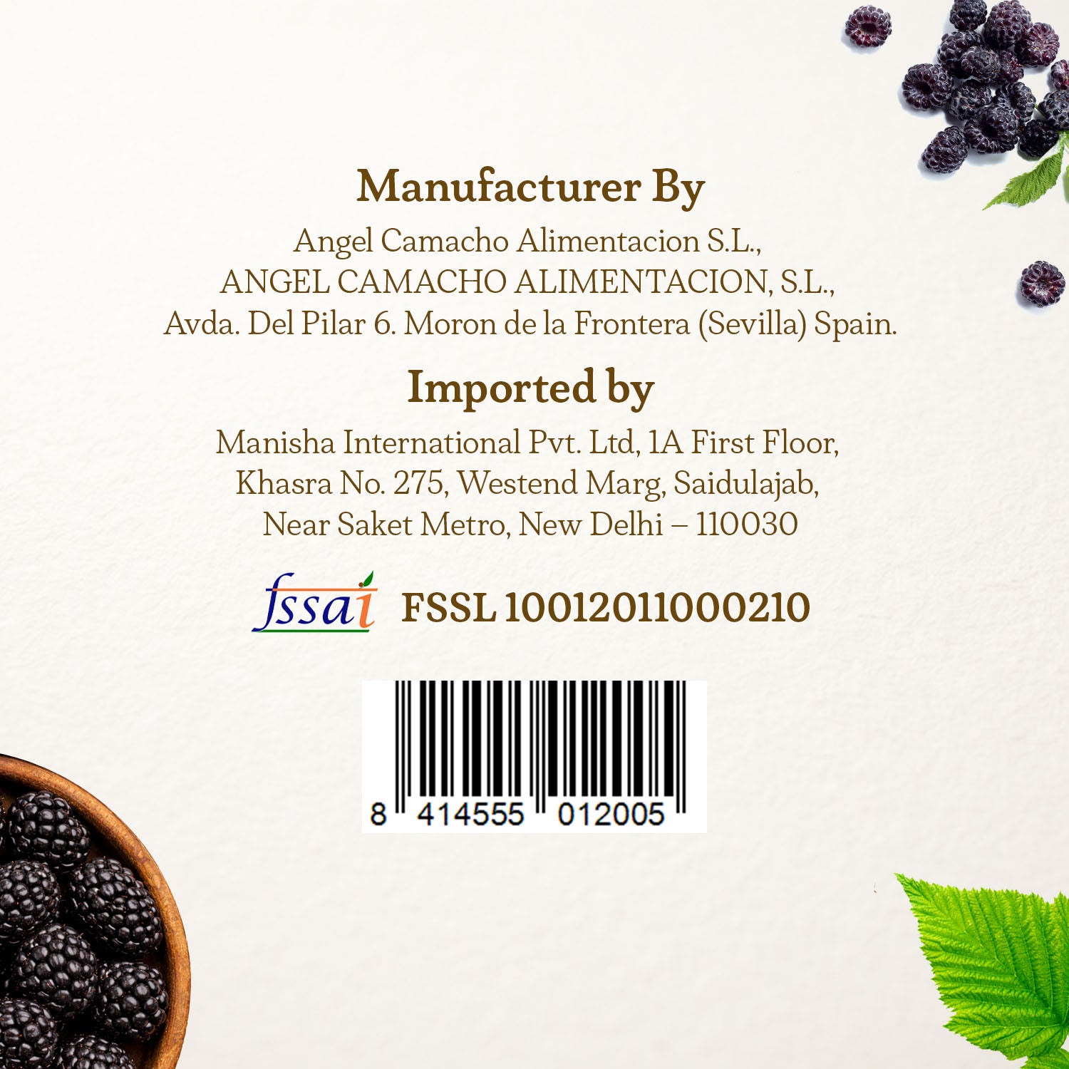 Manufacturer Details: ANGEL CAMACHO ALIMENTACION, S.L., Avda. Del Pilar 6. Moron de la Frontera (Sevilla) Spain. CIF B-41024076